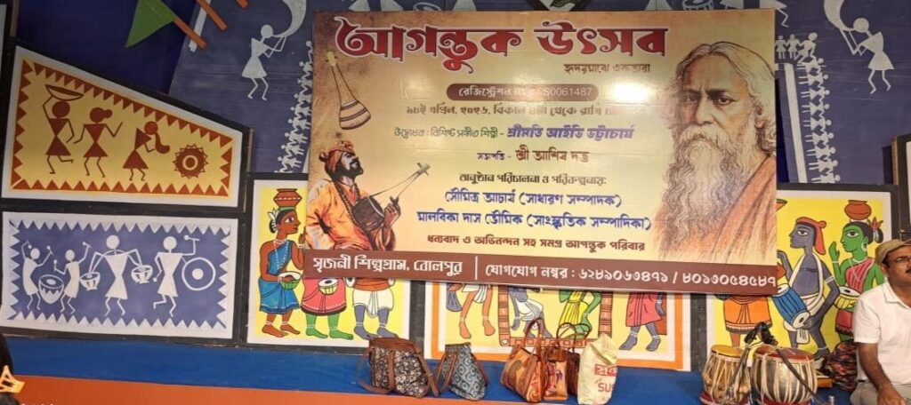 রবীন্দ্রনাথের শান্তিনিকেতনের লালমাটির বুকে সৃজনী শিল্পগ্রামে ‘হৃদয় মাঝে একতারা’ শীর্ষক মায়াবী সন্ধ্যায় সুরের ভেলায় ভাসলেন উপস্থিত দর্শকরা, মেতে উঠলেন সাংস্কৃতিক উৎসবে। সুরের মায়াজাল ঘিরে ধরে ‘সৃজনী’-কে। সৌজন্যে কলকাতার প্রথিতযশা সাংস্কৃতিক প্রতিষ্ঠান ‘আগন্তুক’। সঙ্গীত, আবৃত্তি পাঠ, নৃত্য – পরিচিত শান্তিনিকেতনের সাংস্কৃতিক পরিমণ্ডলে এক নতুন মাত্রা যোগ করে। প্রসঙ্গত, সংস্থাটি দীর্ঘদিন ধরে বাংলার নিজস্ব সংস্কৃতিকে প্রত্যন্ত গ্রামে ছড়িয়ে দেওয়ার চেষ্টা করে আসছে।