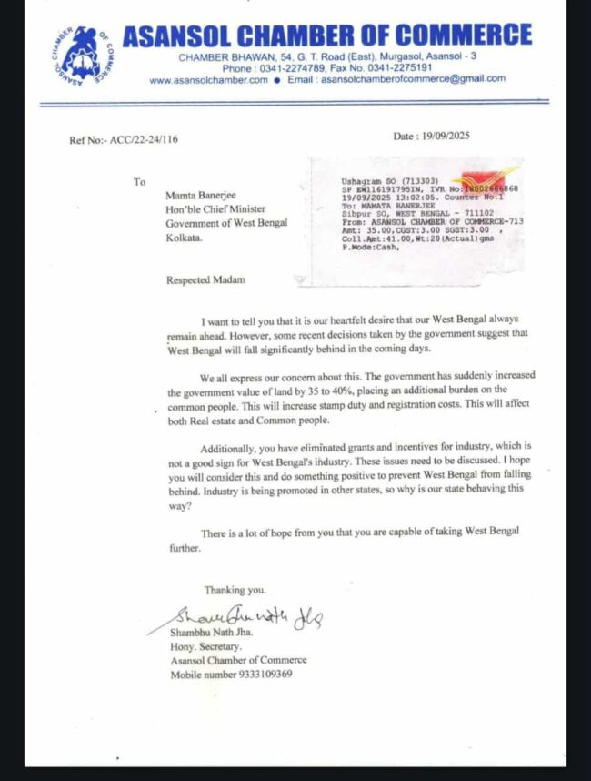 আসানসোল চেম্বার অফ কমার্সের পক্ষ থেকে চিঠি দেওয়া হলো মুখ্যমন্ত্রীকে