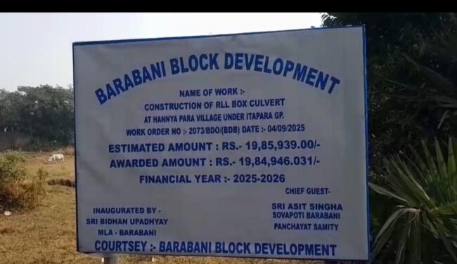 কাজল মিত্র: বারাবনি:- আজ বারাবনী বিধানসভার অন্তর্গত ইটাপাড়া গ্রাম পঞ্চায়েতের হানন্যা পাড়া গ্রামে প্রায় 20 লক্ষ টাকা ব্যয়ে নির্মিত হবে একটি কালভার্ট যে কালভার্ট টির কাজ এর উদ্বোধন করা হল আজ রবিবার। এই কালভার্ট টির নারকেল ফাটিয়ে ও ফিতে কেটে কাজের সূচনা করেন বারাবনির বিধায়ক তথা আসানসোলের মেয়র বিধান উপাধ্যায় একই সঙ্গে উপস্থিত ছিলেন বারাবনী পঞ্চায়েত সমিতির সভাপতি অসিত সিংহ ,এদিন অসিত সিংহ মহাশয় জানান যে এই গ্রামে কালভার্টটি দীর্ঘদিন ধরে জরাজীর্ণ অবস্থায় পড়েছিল গ্রামের মানুষের চাহিদা ছিল যে এই জলাজীর্ণ কালভার্টটি ঠিক করে দেওয়ার যার কারণে তিনি বারাবনির বিধায়ক বিধান উপাধ্যায় কে জানান একই সাথে বিধায়ক বিধান উপাধ্যায়ের প্রচেষ্টায় জেলা শাসকের তরফে তহবিলের ব্যবস্থা করা হয়েছিল,আর সেই থেকেই এই রাস্তার কাজের সূচনা হল যার মোট খরচ হবে প্রায় কুড়ি লক্ষ টাকা।