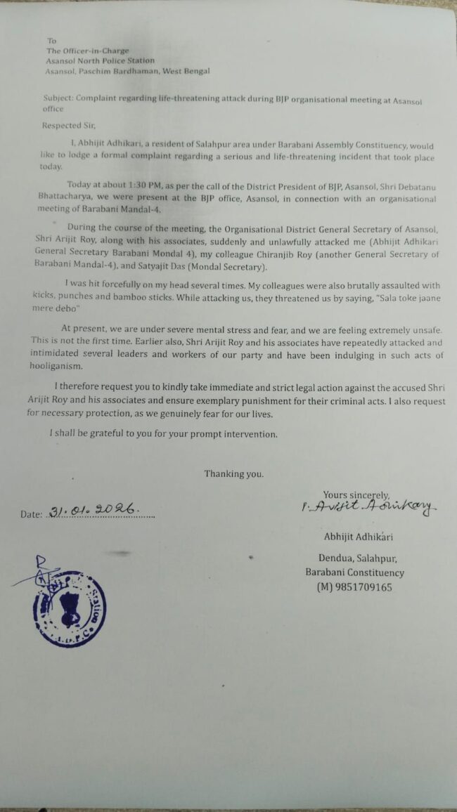 ঘটনার পর আসানসোল উত্তর থানায় লিখিত অভিযোগ দায়ের হয়েছে। অভিযুক্তদের বিরুদ্ধে কড়া আইনি পদক্ষেপ ও ব্যক্তিগত নিরাপত্তার দাবি জানিয়েছেন আক্রান্তরা। তবে প্রশ্ন উঠছে—দল কি আদৌ অরিজিৎ রায়ের মতো ‘প্রভাবশালী’ নেতার বিরুদ্ধে কোনও সাংগঠনিক ব্যবস্থা নেবে, নাকি সবকিছুই ঢেকে যাবে নির্বাচনী অঙ্কের খাতায়?